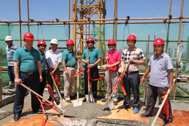 7月28日,在高農(nóng)生物園新華揚九龍新型酶制劑基地綜合車間頂層,高農(nóng)集團董事長張曉玲、新華揚董事長詹志春及有關(guān)領(lǐng)導(dǎo)共同揮鍬作業(yè),完成了最后一塊混凝土的澆筑,正式為新華揚九龍新型酶制劑基地一期工程封頂,這也標(biāo)志著亞洲最大新型酶制劑基地在園區(qū)順利落成,奠定了園區(qū)在全國生物飼料添加劑領(lǐng)域領(lǐng)先地位。